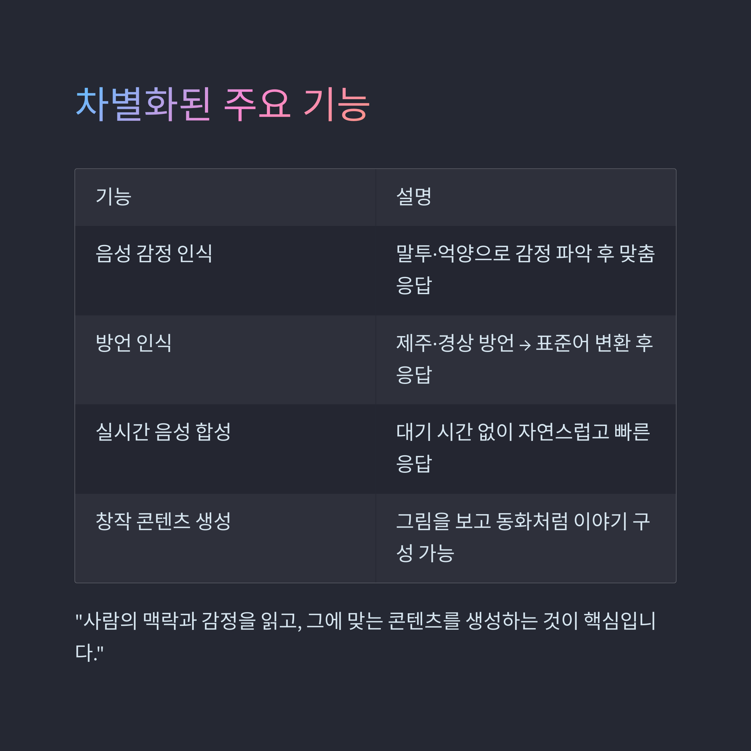 | 음성 감정 인식 | 말투·억양으로 사용자의 감정 파악 후 감성 맞춤 응답 |