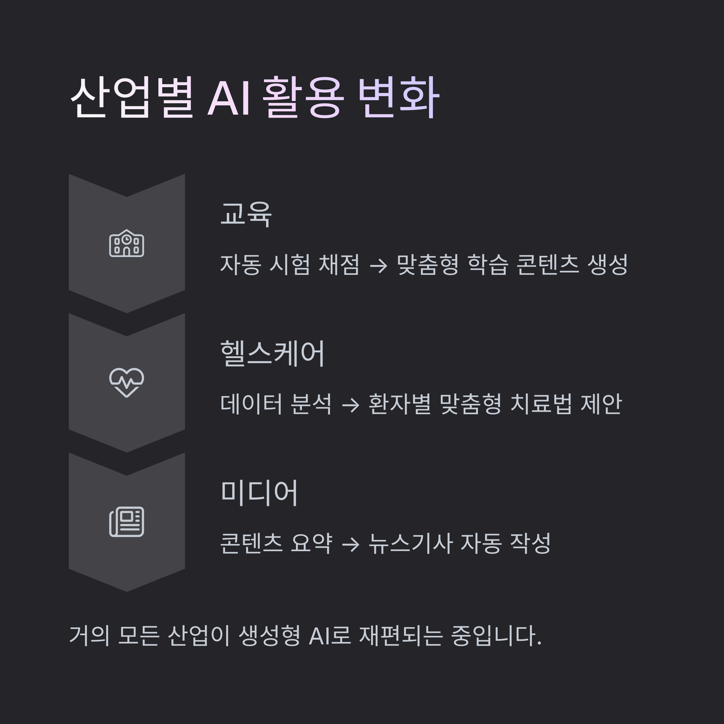 | 교육 | 자동 시험 채점 | 맞춤형 학습 콘텐츠 생성 |