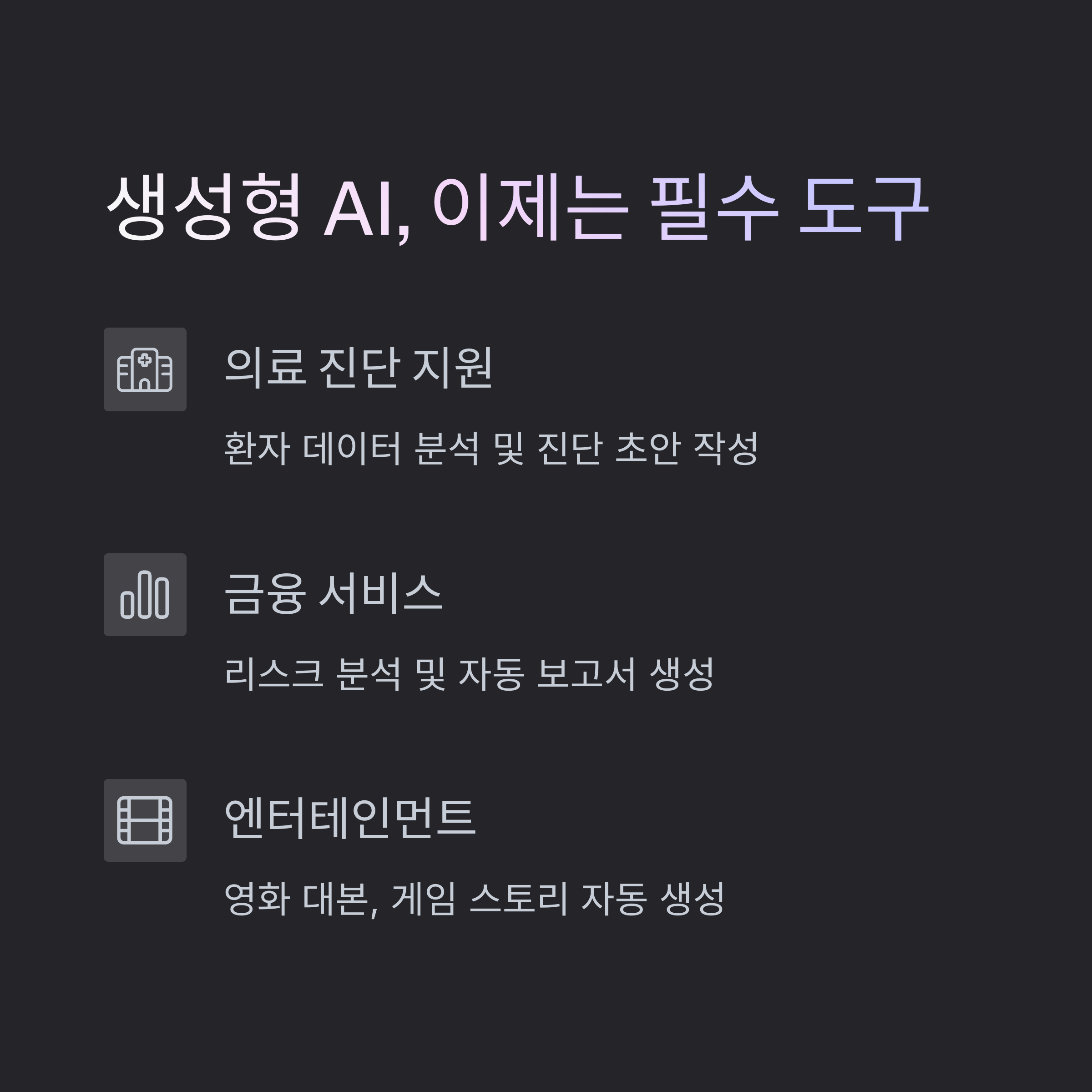 2025년 현재, 생성형 AI는 단순한 텍스트 작성 도구를 넘어 다양한 영역에서 활약하고 있습니다.