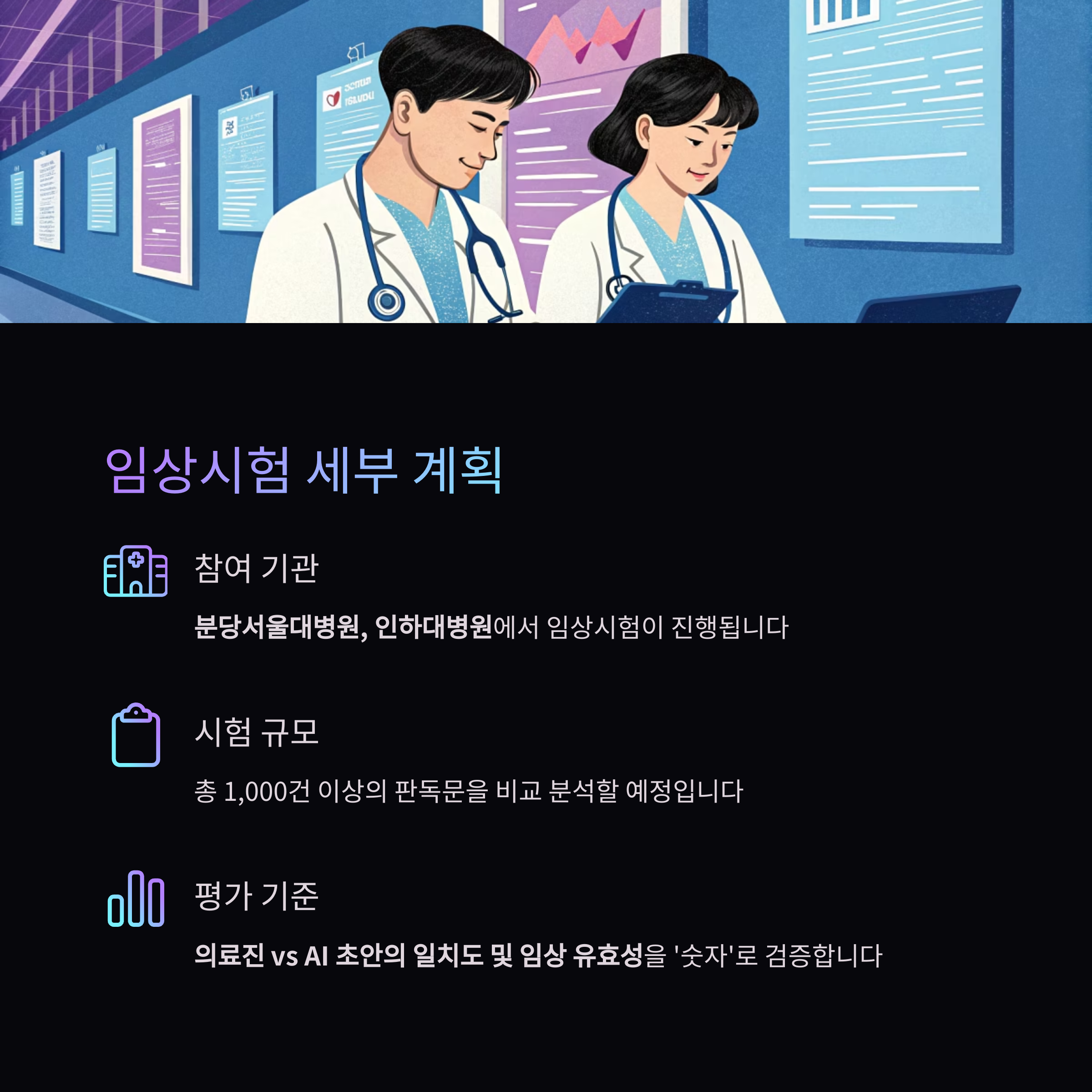 - 기준: 의료진 vs AI 초안의 일치도 및 임상 유효성