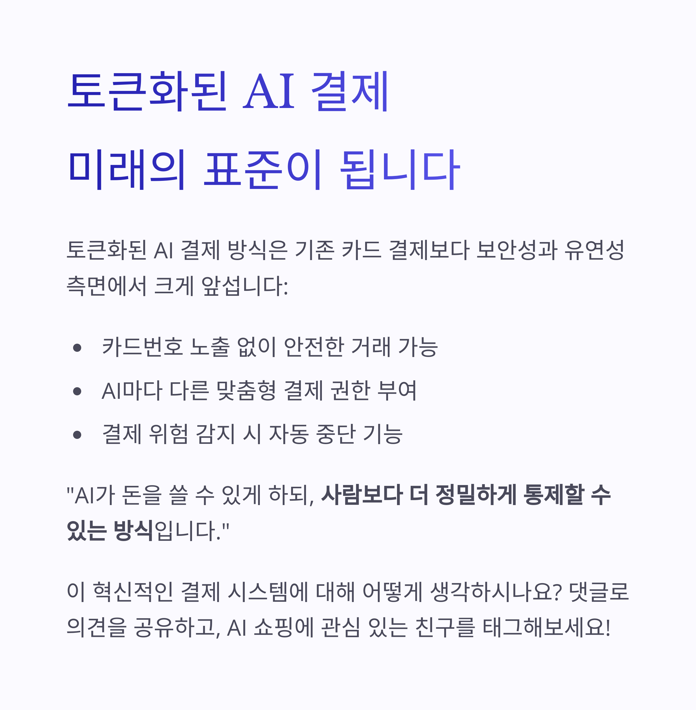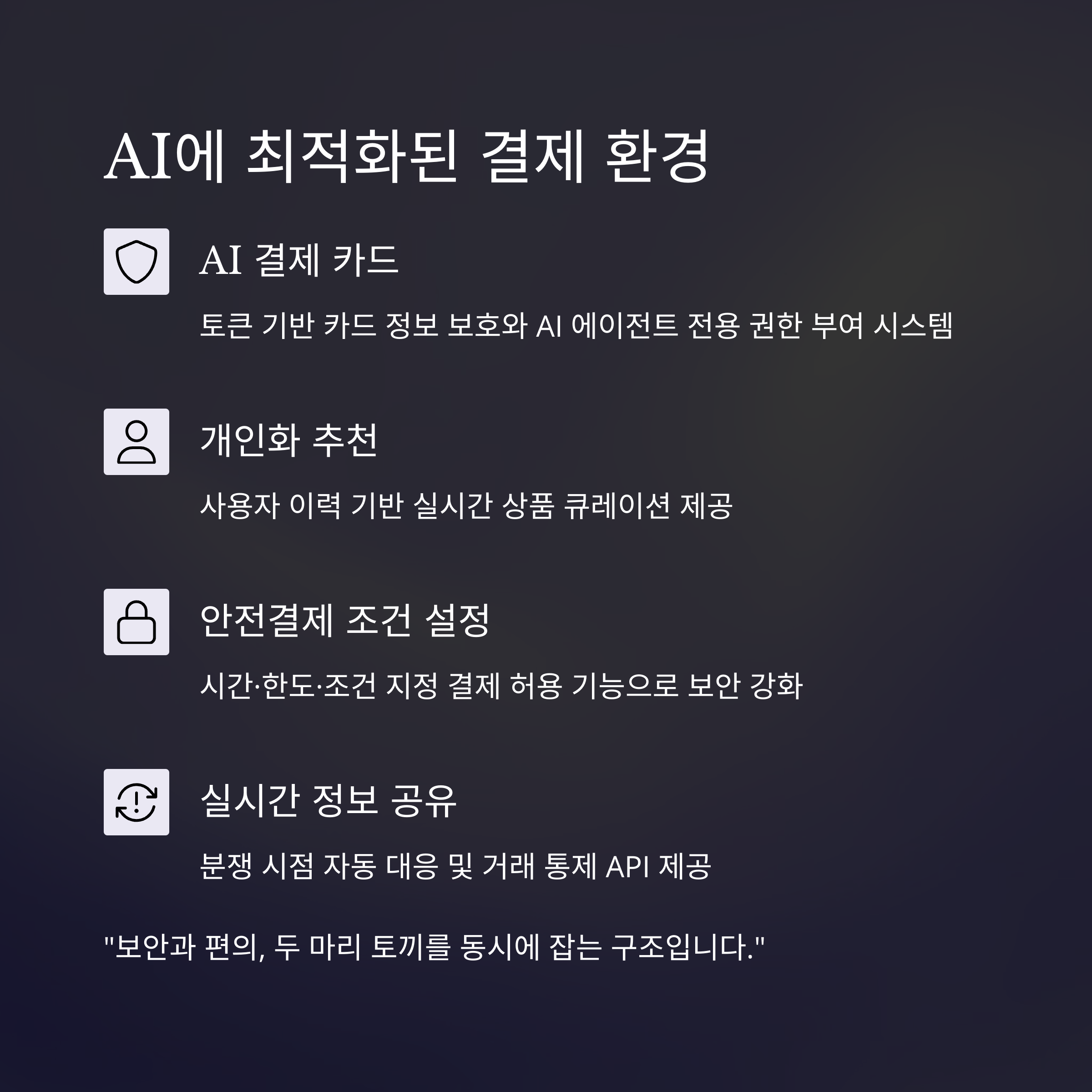 | AI 결제 카드 | 토큰 기반 카드 정보 보호, AI 에이전트 전용 권한 부여 |