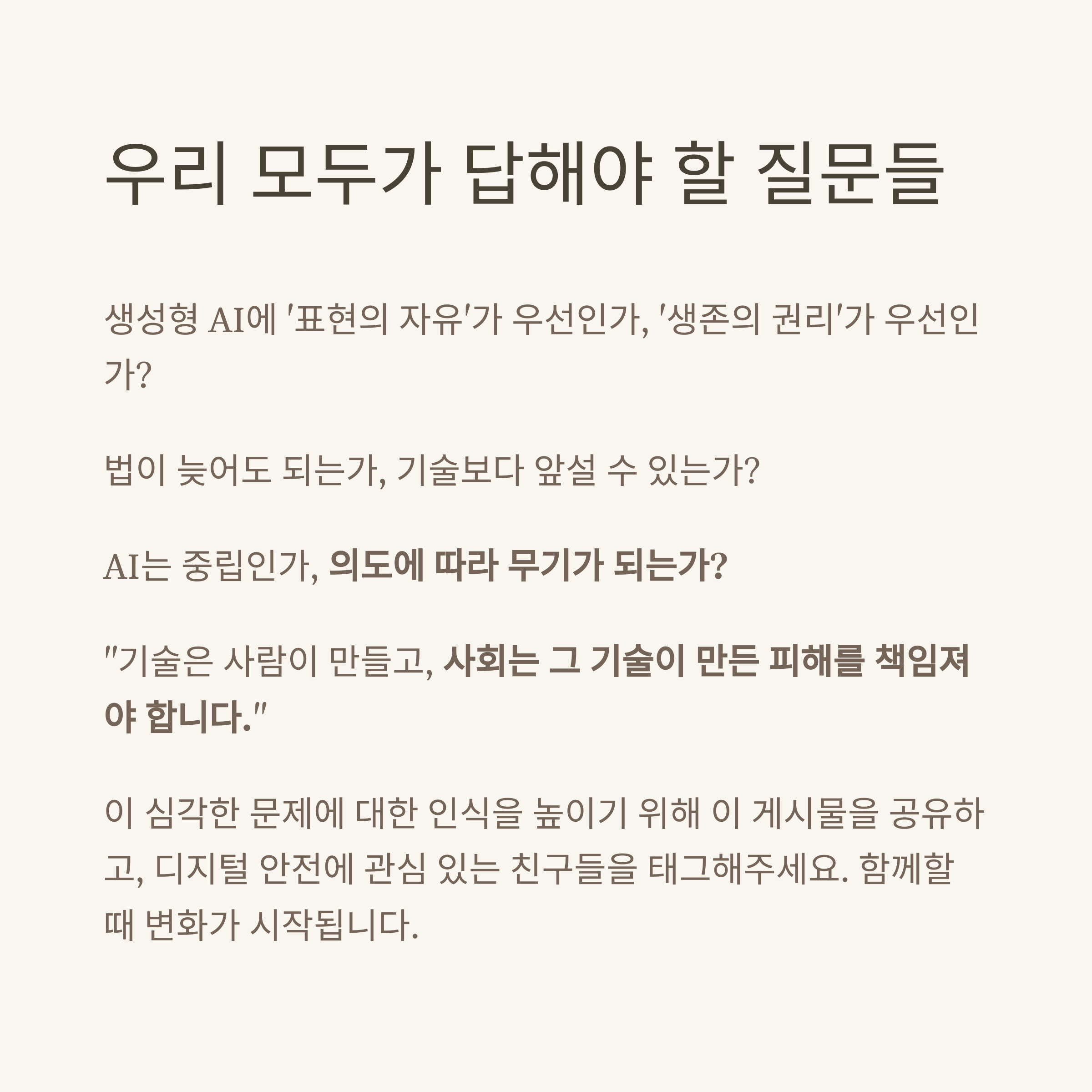 - 생성형 AI에 ‘표현의 자유’가 우선인가, ‘생존의 권리’가 우선인가?