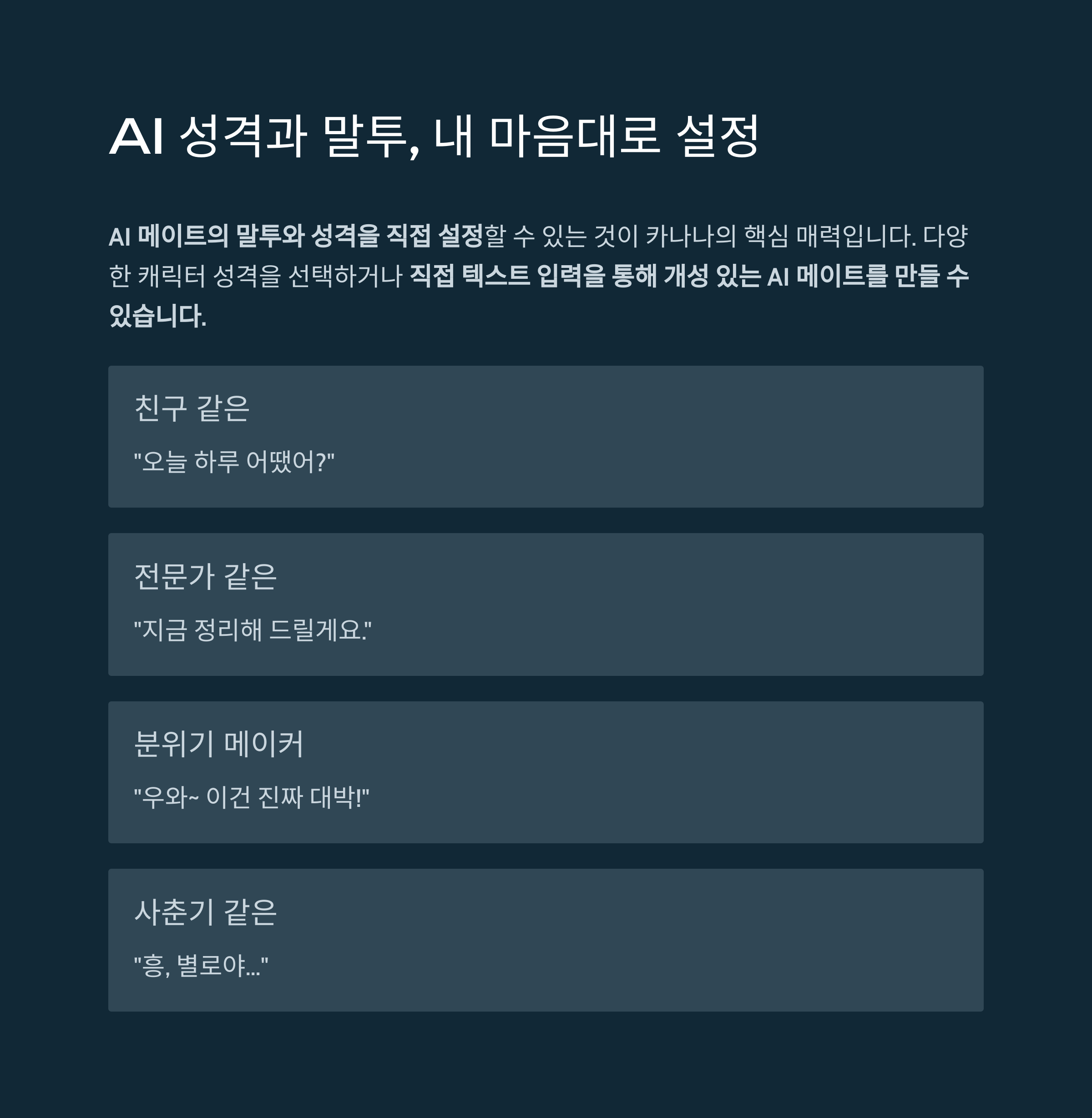 ‘카나나’의 핵심 매력 중 하나는 AI 메이트의 말투와 성격을 직접 설정할 수 있다는 점입니다.