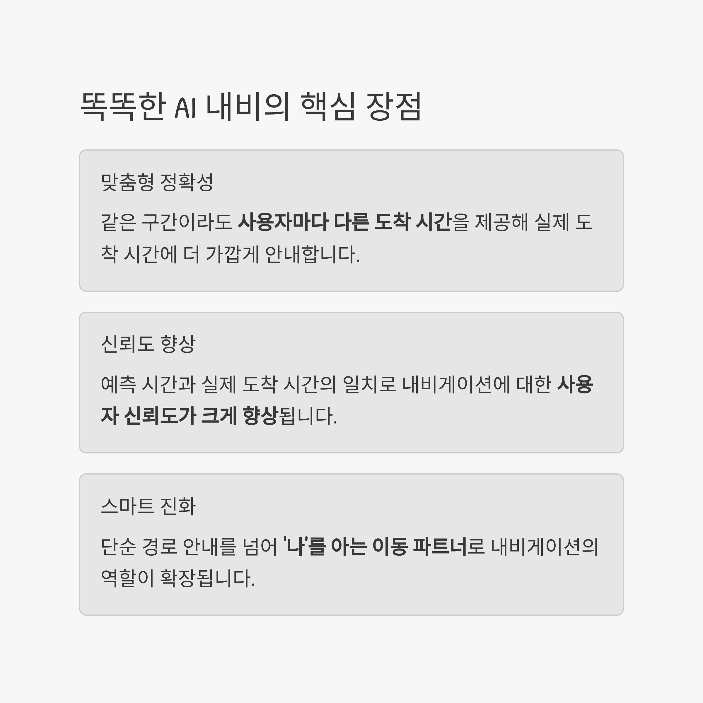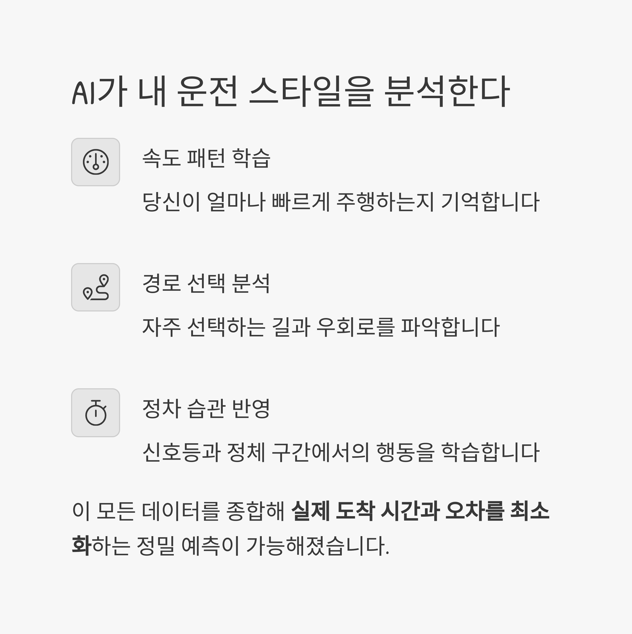 개인별 주행 스타일을 학습해 실제 도착 시간에 가까운 예측을 제공하는 것이 핵심입니다.