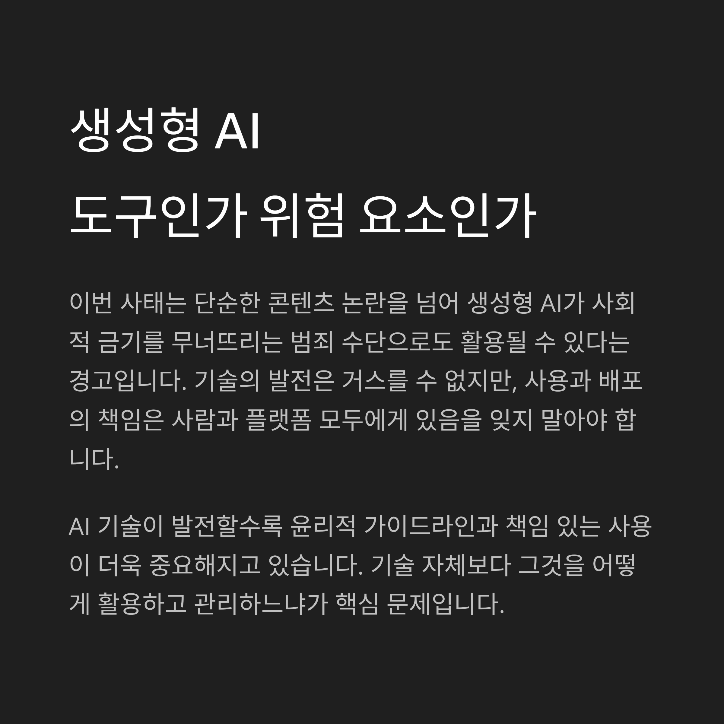AI 기술의 윤리적 한계와 플랫폼의 관리 부재가 동시에 비판받고 있습니다.