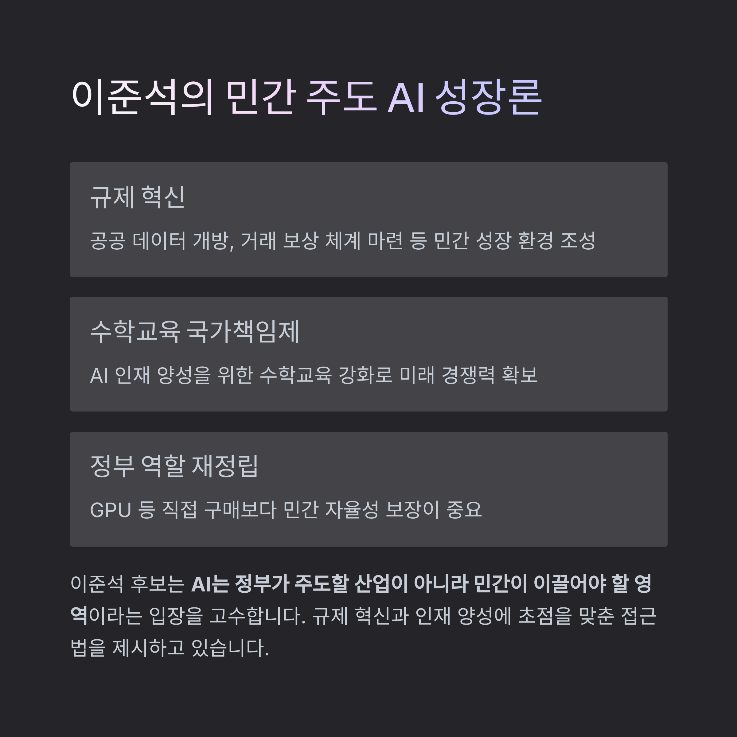 개혁신당 이준석 후보는 AI는 정부가 주도할 산업이 아니라 민간이 이끌어야 할 영역이라는 입장을 고수합니다.