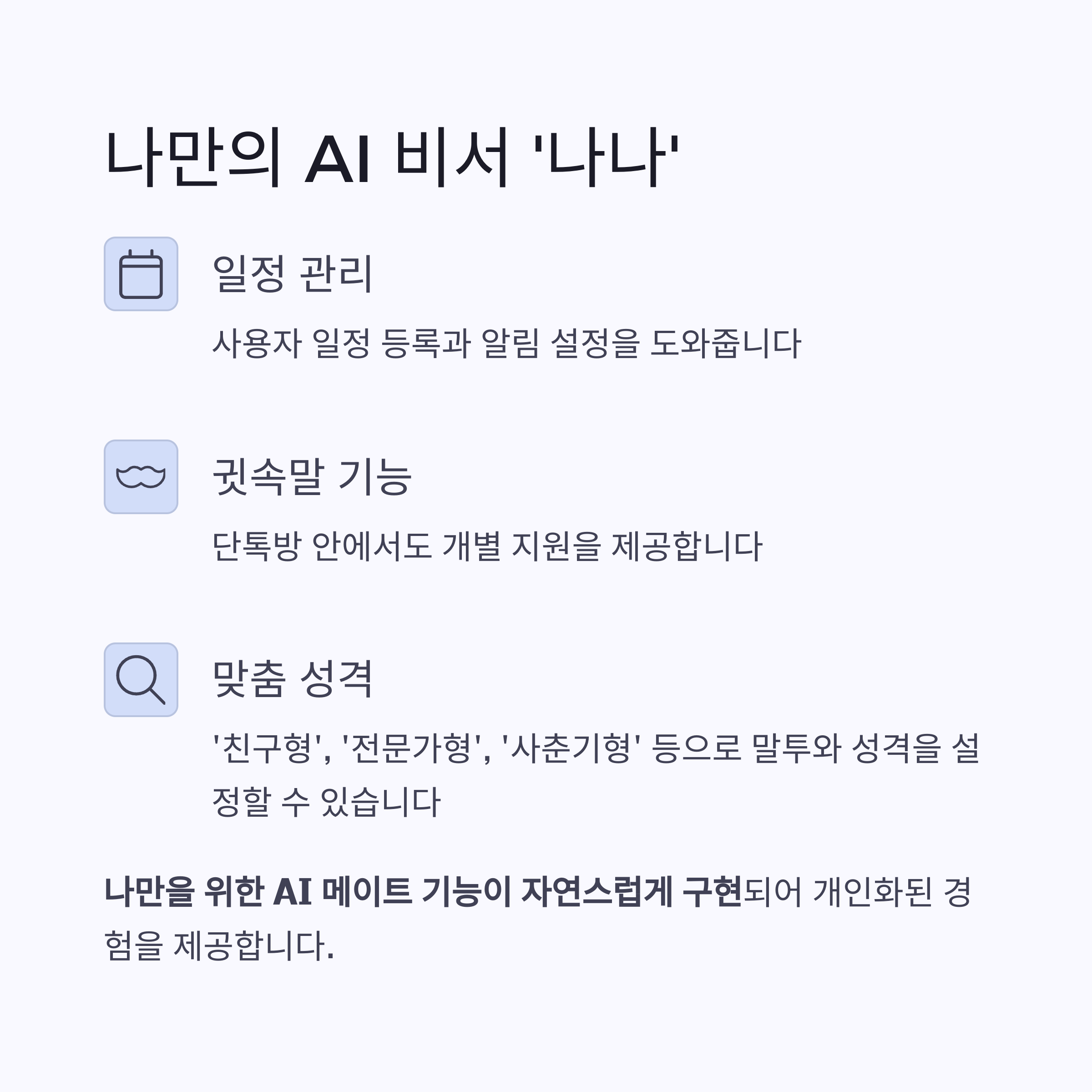 말투와 성격은 ‘친구형’, ‘전문가형’, ‘사춘기형’ 등으로 자유롭게 설정할 수 있으며,