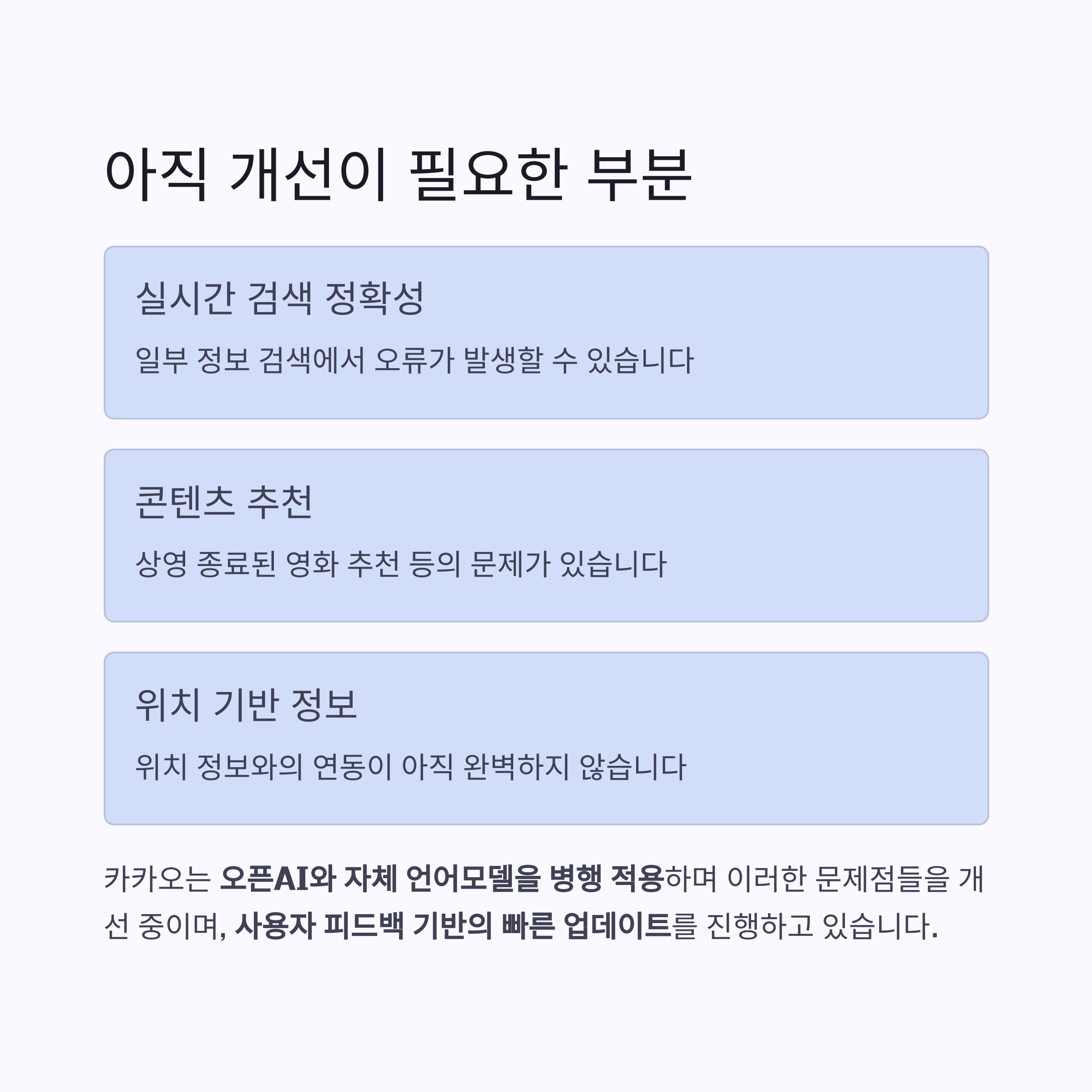 이런 문제는 카카오 측이 오픈AI와 자체 언어모델을 병행 적용하며 개선 중이며,
