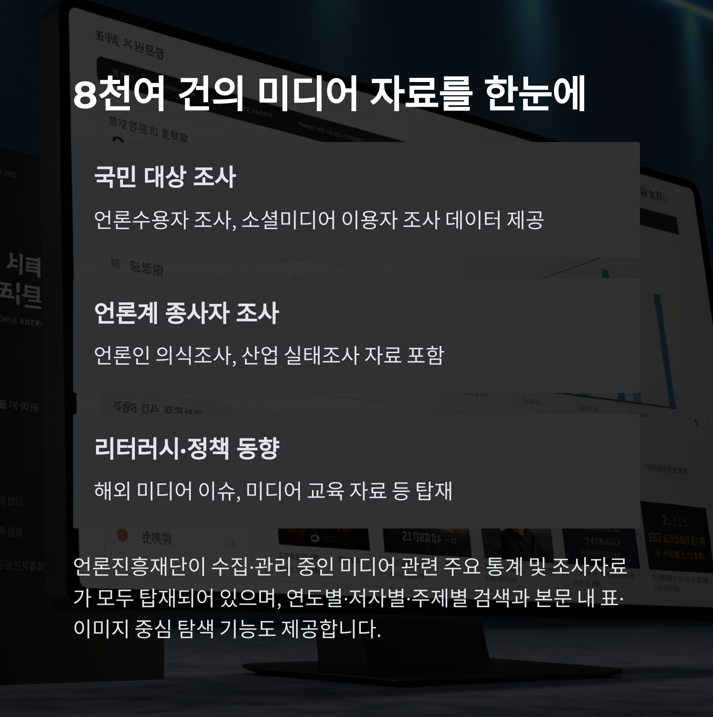 플랫폼에는 언론진흥재단이 수집·관리 중인 미디어 관련 주요 통계 및 조사자료 8천여 건이 탑재되어 있으며,