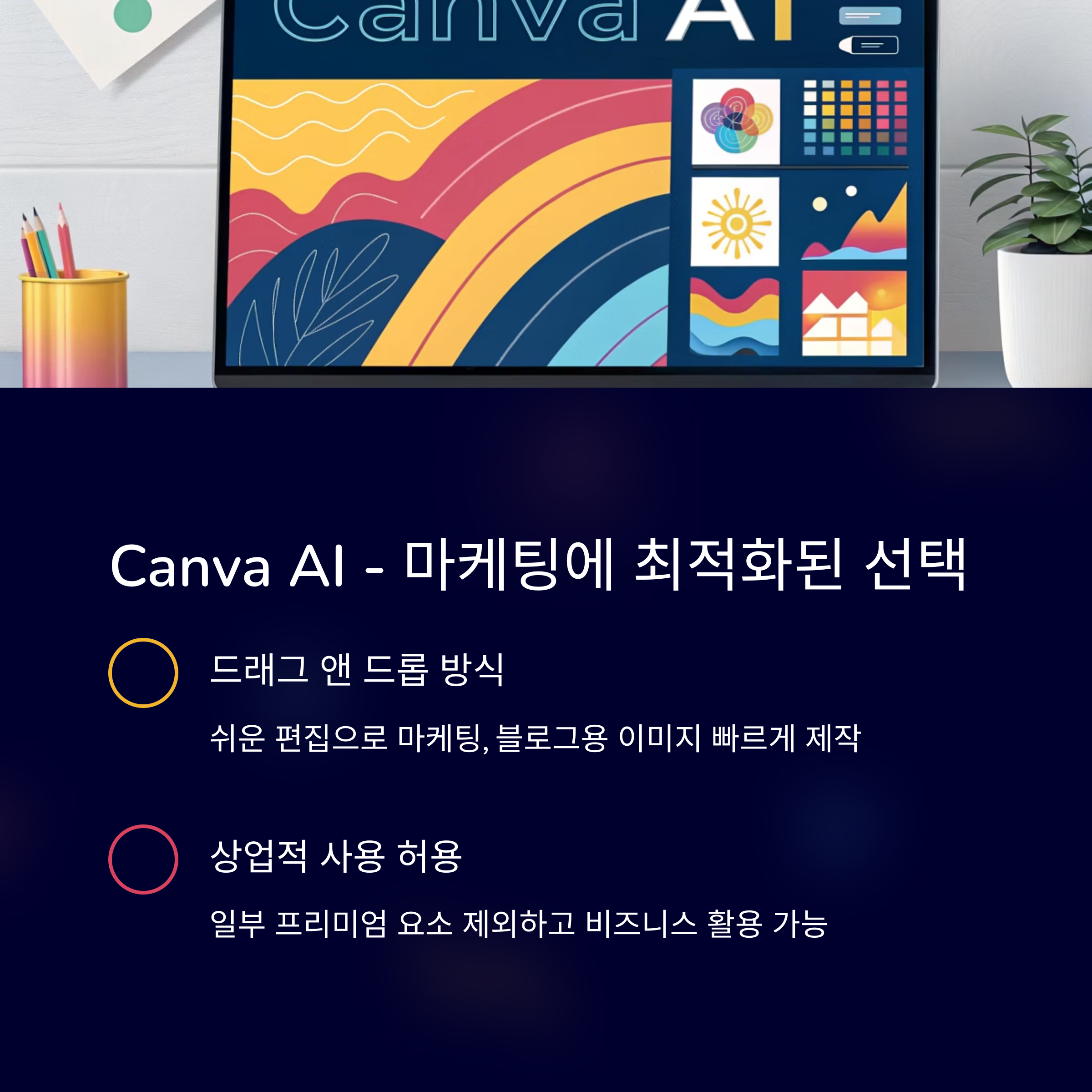 Canva AI는 특히 마케팅, 블로그용 이미지를 빠르게 제작할 수 있어 인기입니다.
