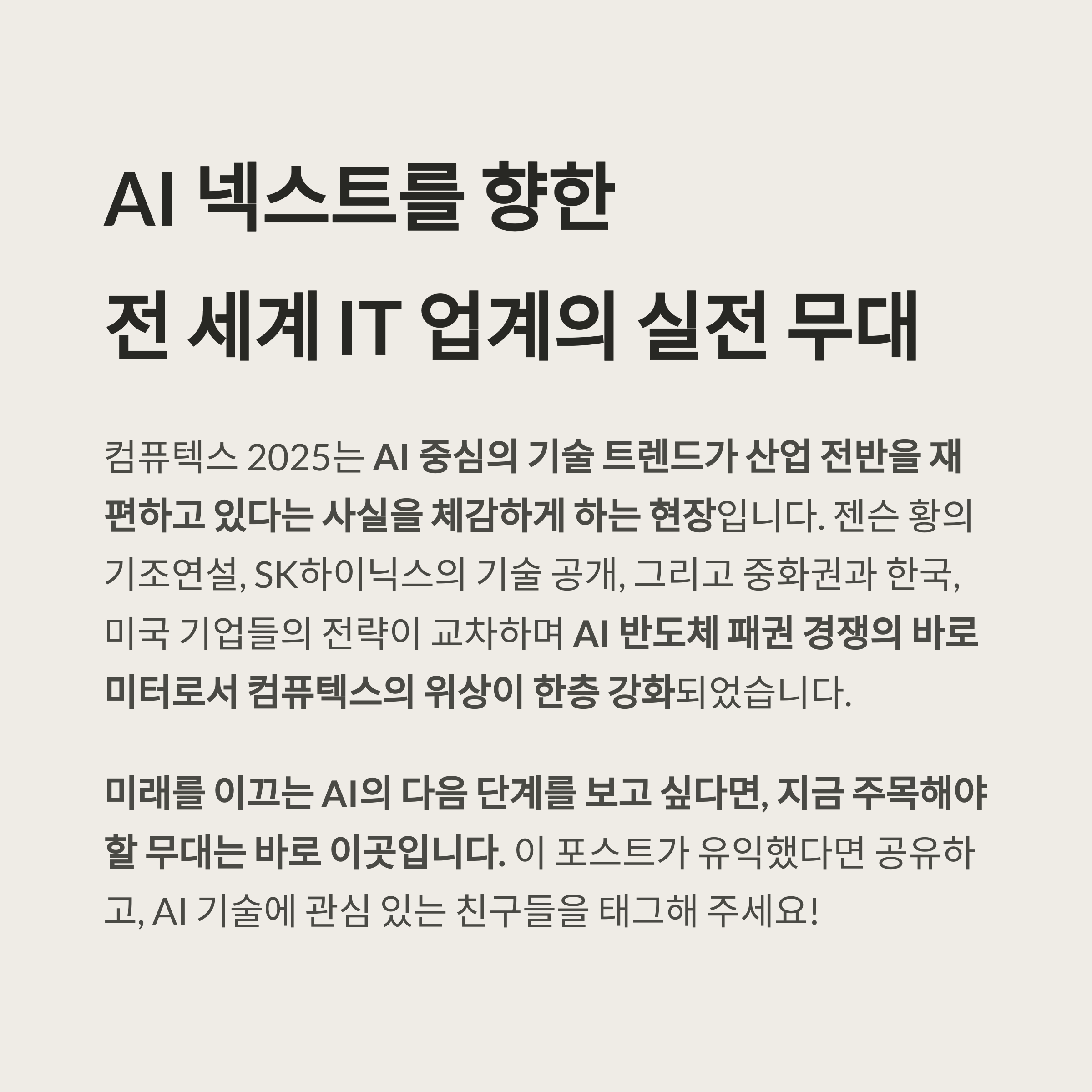 컴퓨텍스 2025는 AI 중심의 기술 트렌드가 산업 전반을 재편하고 있다는 사실을 체감하게 하는 현장입니다.