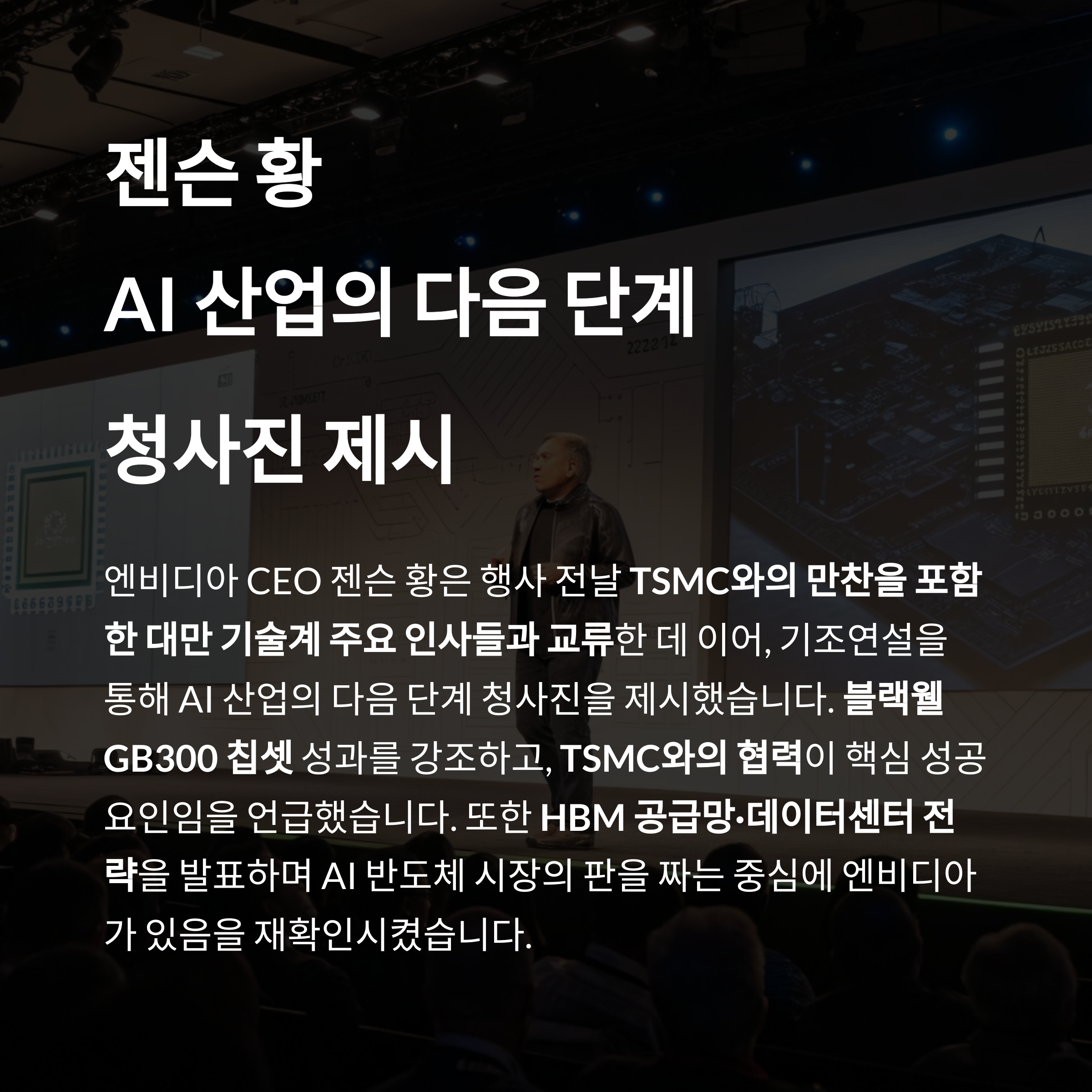 AI 반도체 시장의 판을 짜는 중심에 엔비디아가 있음을 재확인시킨 자리였습니다.
