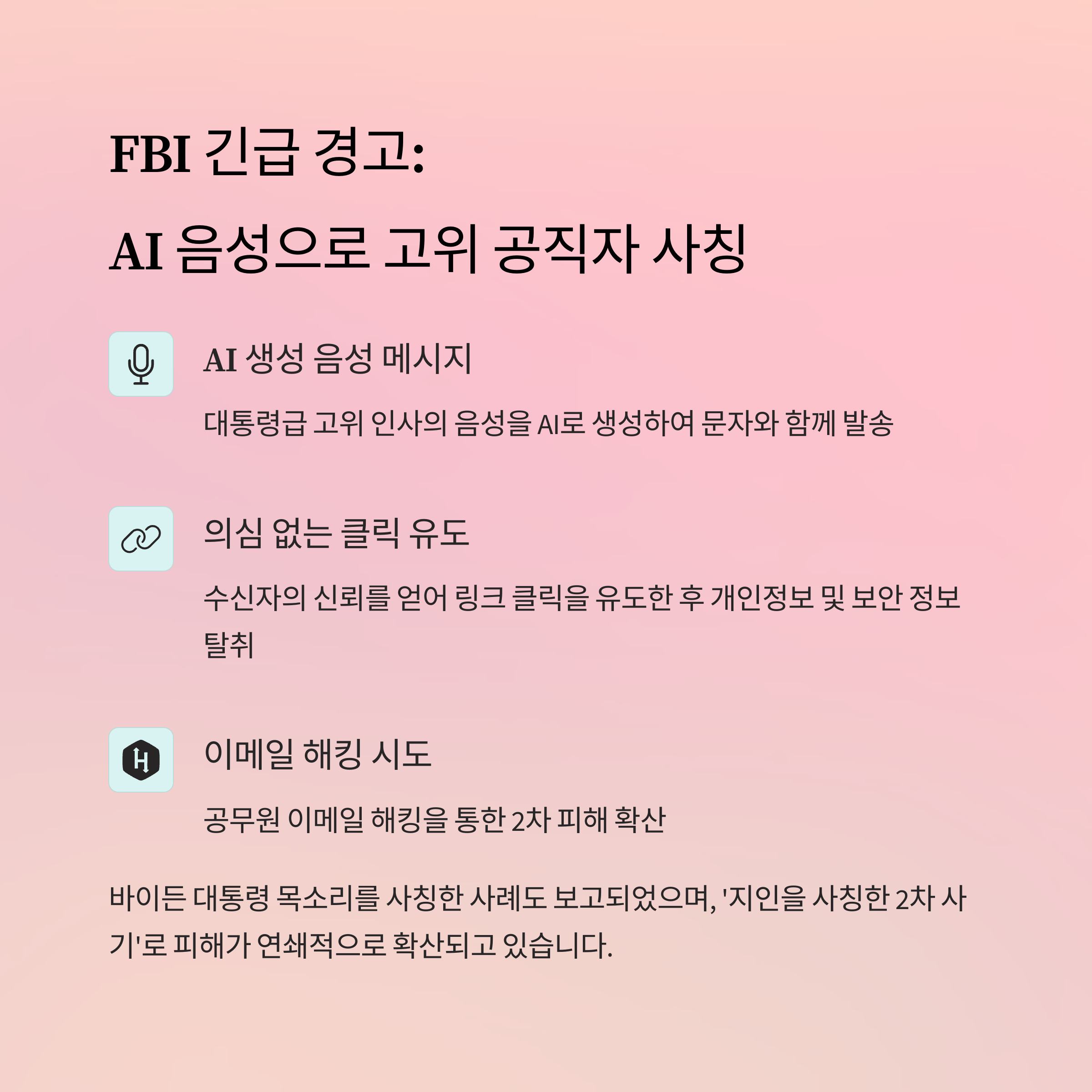 FBI는 최근 AI 음성 메시지로 고위 관료를 사칭하는 사기 수법이 급속도로 확산되고 있다며 공무원들을 상대로 긴급 경고를 발령했습니다.
