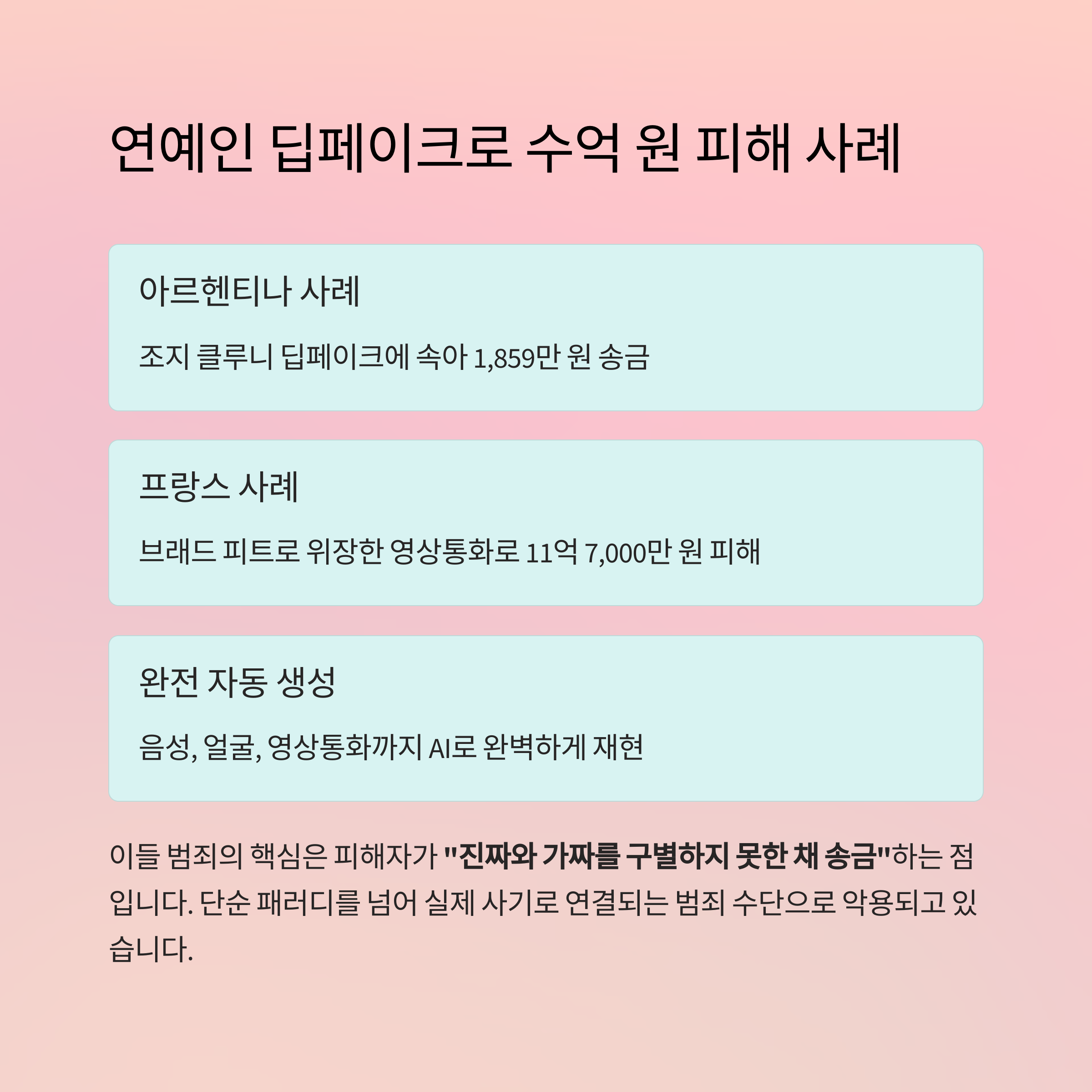 AI 기반 딥페이크 영상은 단순 패러디 수준을 넘어, 실제 사기로 연결되는 범죄 수단으로 악용되고 있습니다.