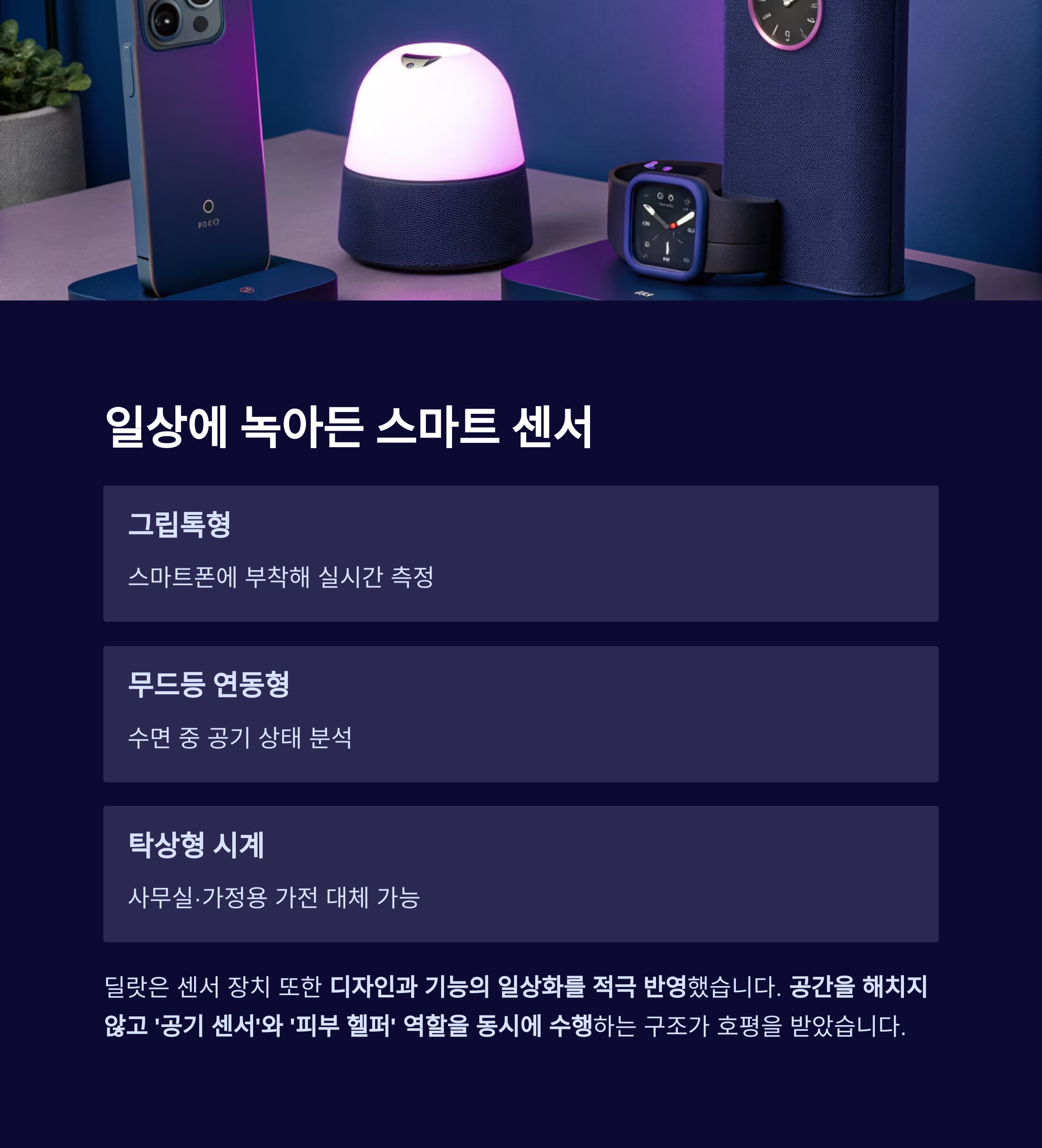 공간을 해치지 않고 ‘공기 센서’와 ‘피부 헬퍼’ 역할을 동시에 수행하는 구조가 호평을 받았습니다.