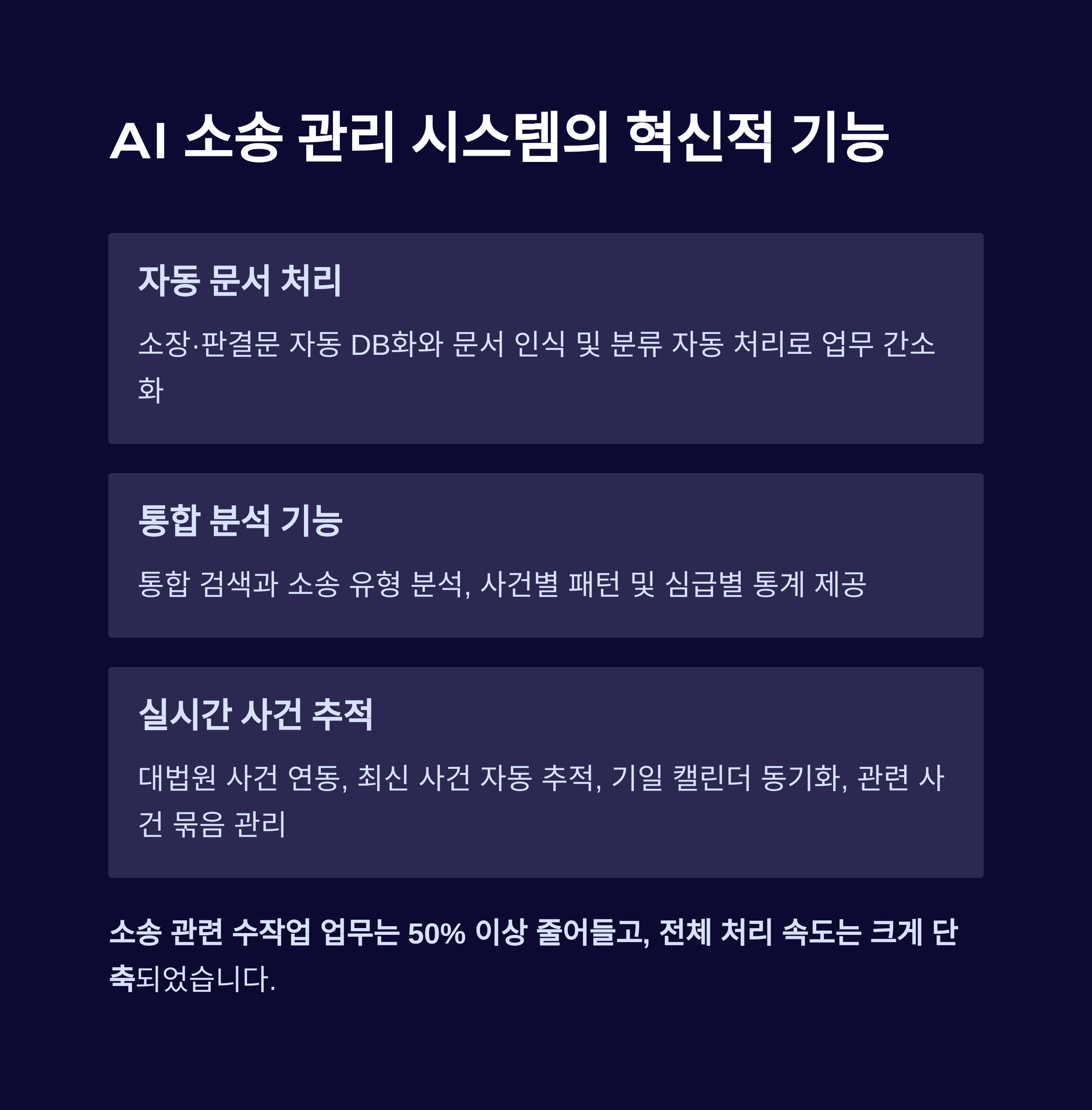 소송 관련 수작업 업무는 50% 이상 줄어들고, 전체 처리 속도는 크게 단축됐습니다.