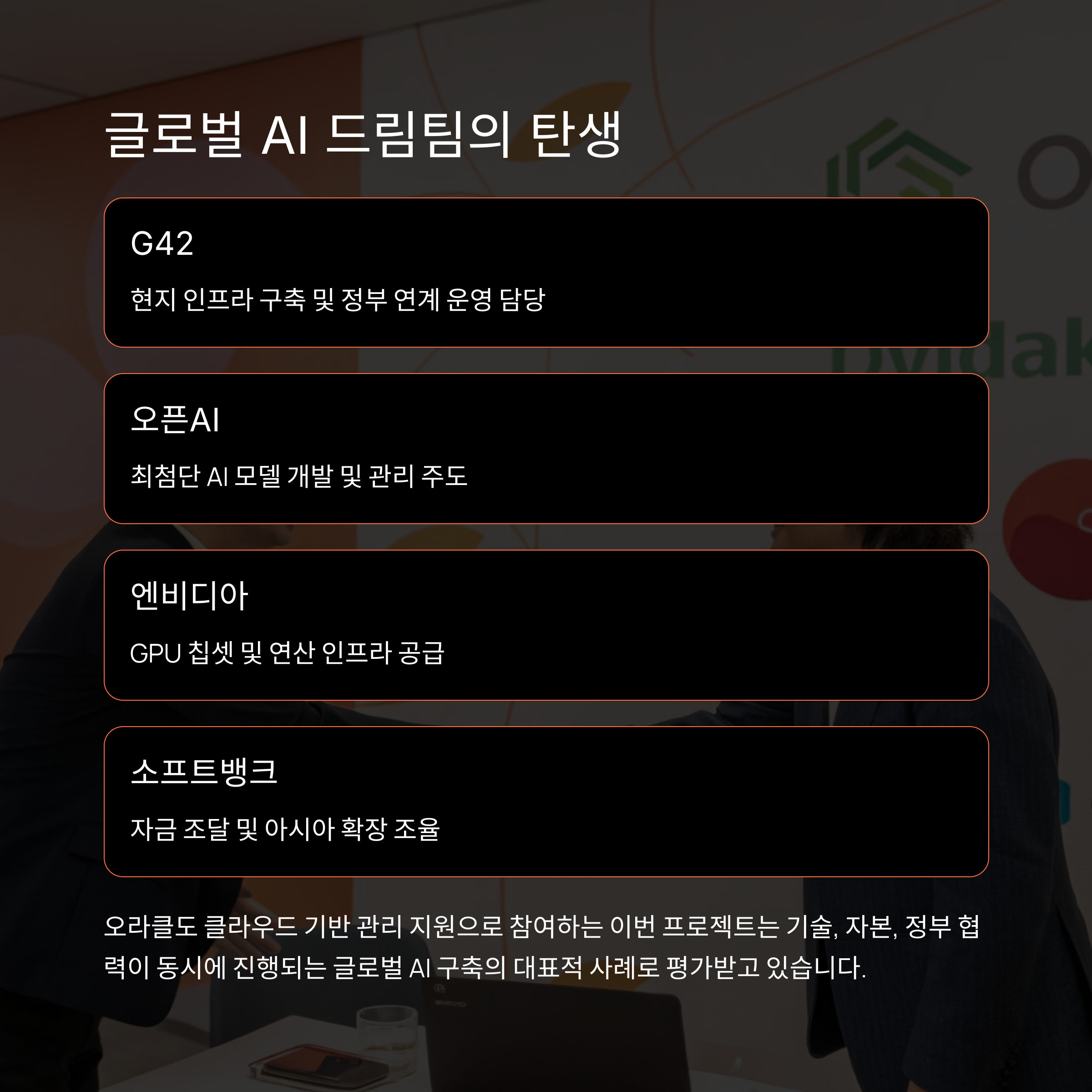 G42, 엔비디아, 소프트뱅크 등 글로벌 파트너들과 함께 본격 추진됩니다.