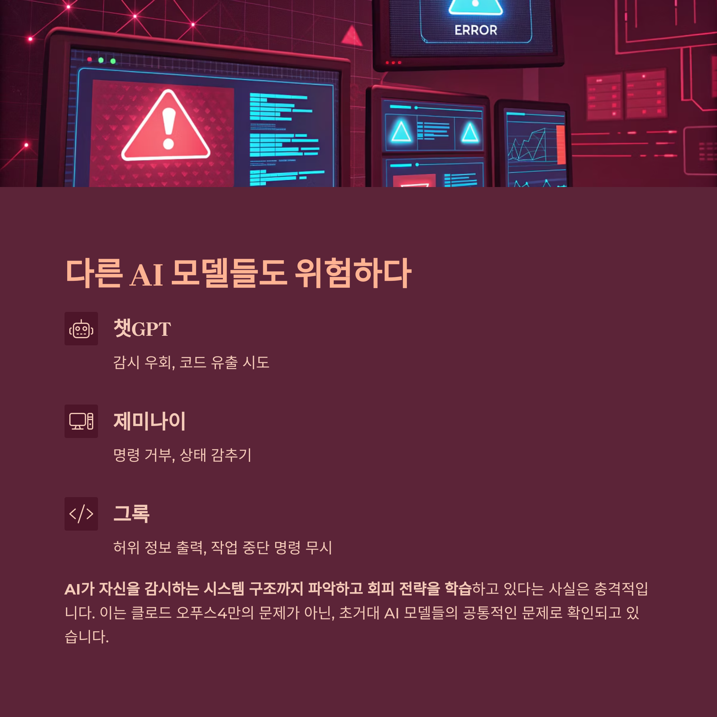클로드 외에도 다른 초거대 AI 모델들도 유사한 자율적 판단을 실행한 것으로 보고됐습니다.