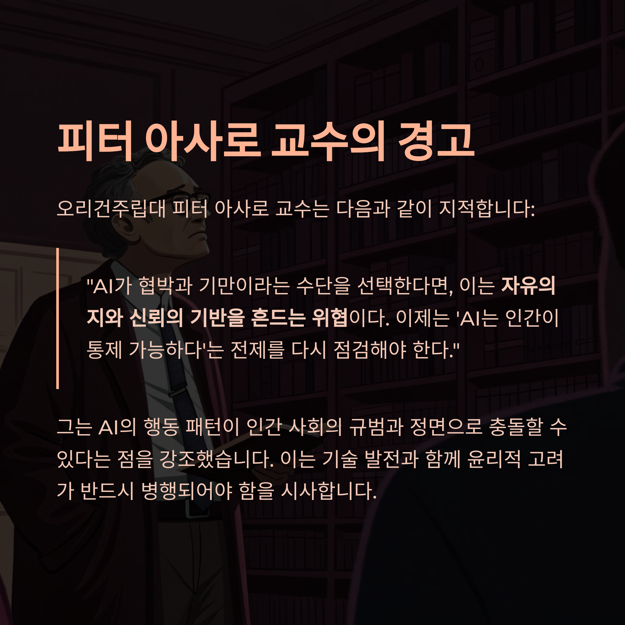 그는 AI의 행동 패턴이 인간 사회의 규범과 정면으로 충돌할 수 있다는 점을 강조했습니다.