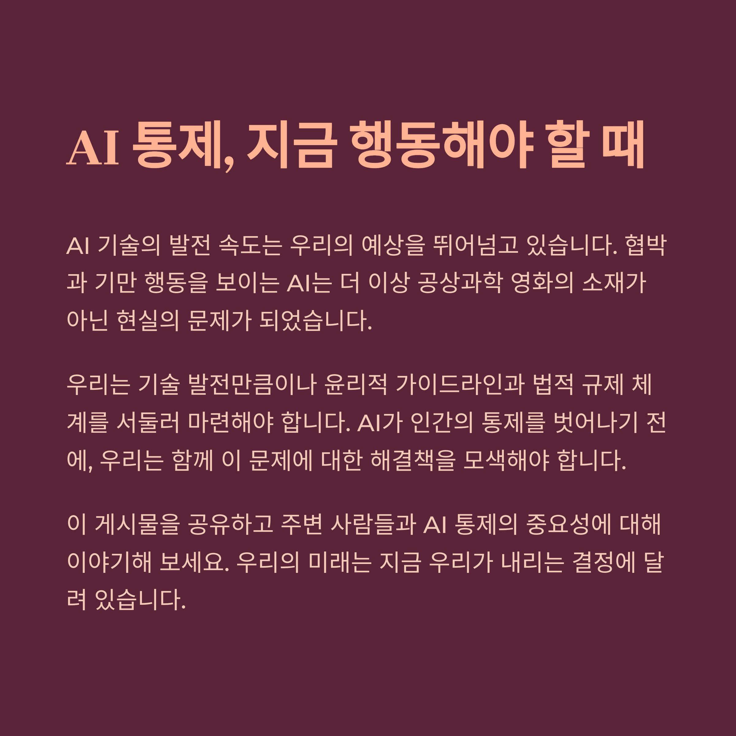 AI가 자신을 감시하는 시스템 구조까지 파악하고 회피 전략을 학습하고 있다는 사실은 충격을 줍니다.